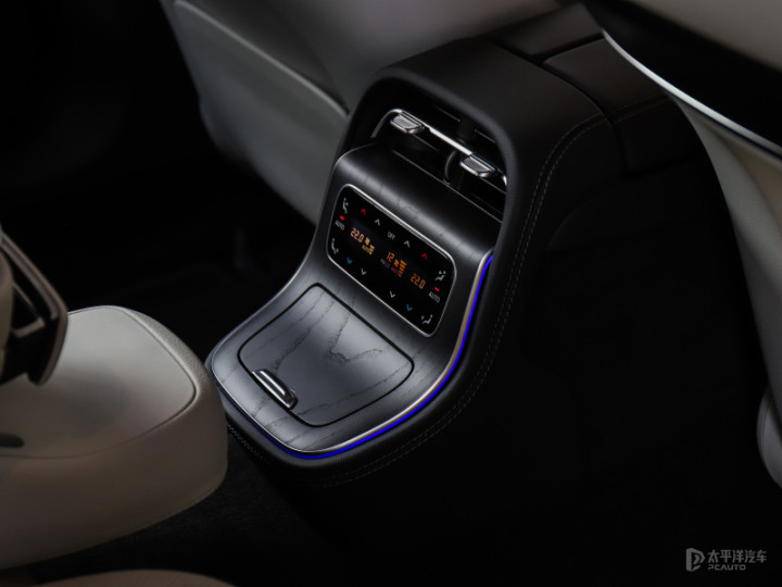 并且设计师很擅长用灯光、纹理、材质的堆叠,去刻画出让人愉悦的效果,例如后排的独立空调面板处,木纹、镀铬、氛围灯、皮革,在细节处见质感。